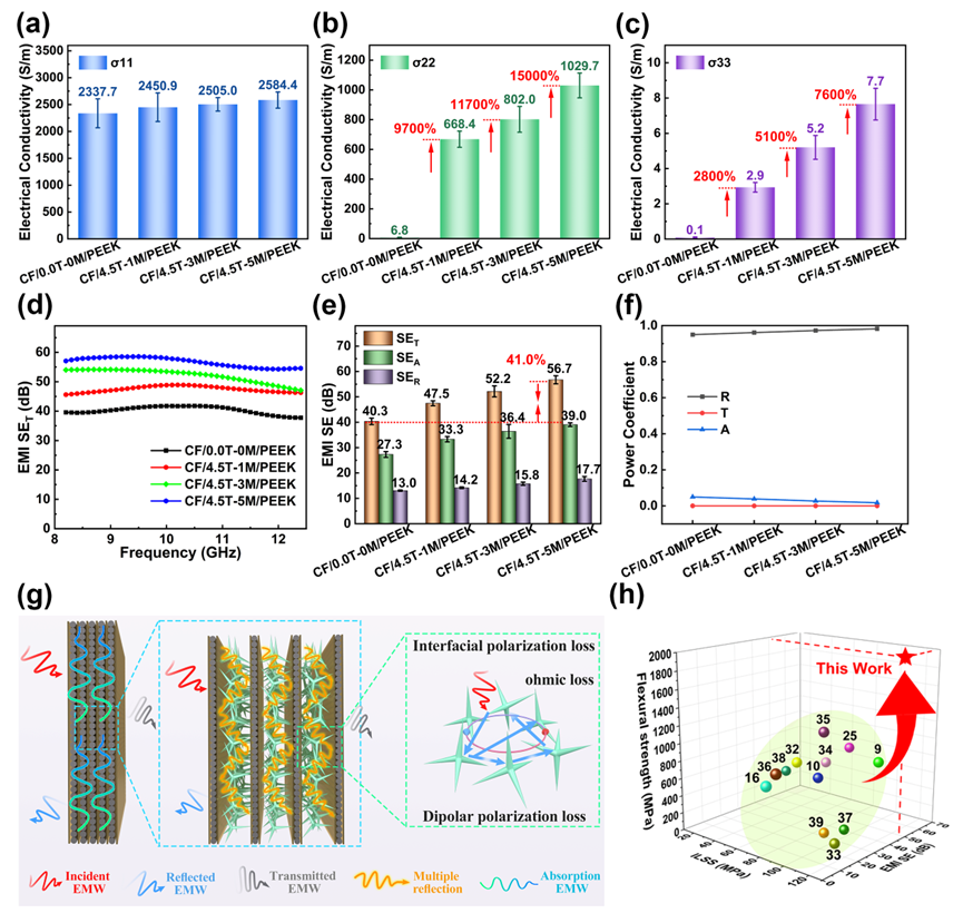 碳纤维增强热塑性聚醚醚酮(CF/PEEK)层合板因其优异的轻质高强、耐腐蚀性、耐高温及可回收性,在航空航天、国防军工、高端装备、人形机器人等战略前沿领域具有广泛的应用前景。然而,CF/PEEK层合板在服役过程中会受到各类冲击载荷作用进而导致层间开裂等损伤,以及新一代装备对高功率电子设备抗电磁干扰(EMI)、导电导热等新的需求,现有碳纤维复合材料的单一性能难以满足极端环境、工况下的综合性能需求。因此,亟需开发兼具结构性与功能特性的CF/PEEK复合材料。国产探花