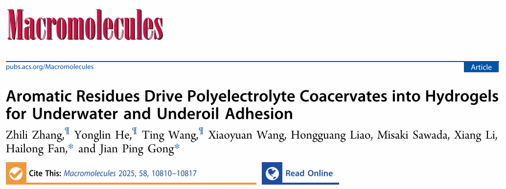 近日,我院新进“百人计划”特聘副教授范海龙在水下黏附材料领域取得重要进展:他们受自然界相分离体系中的固有无序蛋白氨基酸序列启发,研发出一种无需外部刺激即可自发实现相分离与相转变的凝聚层(coacervate)体系,该材料不仅在水下展现出卓越的黏附性能,还能在油环境中稳定工作,相关成果发表于《Macromolecules》。范海龙副教授、北海道大学龚剑萍教授为共同通讯作者,国产探花