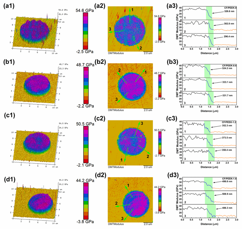 通过AFM DMT模量图谱与微观表征深入揭示了性能同步提升的内在机理:性能跨越的核心在于成功构筑了“梯度模量界面层”。相较于未改性复合材料界面处“断崖式”的模量突变,1.2 wt.% CNTs的引入将界面层厚度调控至约361.4 nm,形成了一个平滑过渡的梯度模量层(见图3),从而显著缓解了高模量纤维与低模量基体间的应力集中。