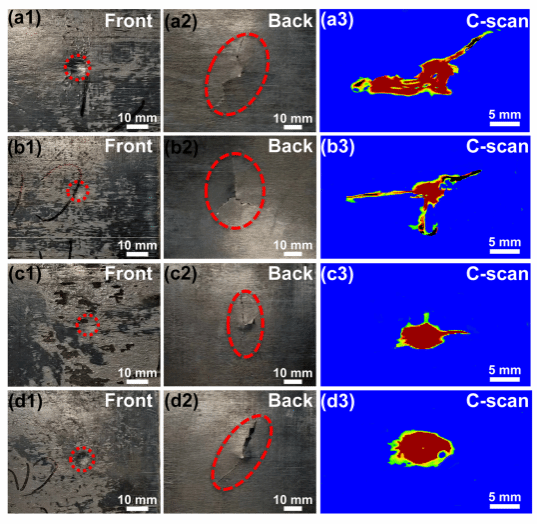 CF/PEEK复合材料的抗冲击性能,如图4a1-a2所示,未添加CNTs的CF/PEEK复合材料在冲击后前表面出现较深凹痕,而后表面的裂纹呈锯齿状扩展(图4a2)。添加CNTs后,裂纹的形状和扩展方向发生了变化。当掺入0.6 wt.% CNTs时,裂纹沿后表面三叉星图案的方向扩展(图4b2)。CF/PEEK-1.2复合材料表现出图4c2中所示的最短裂纹长度。CF/PEEK-1.8复合材料中的裂纹呈直线扩展,其扩展长度大于CF/PEEK-1.2复合材料(图4d2)。