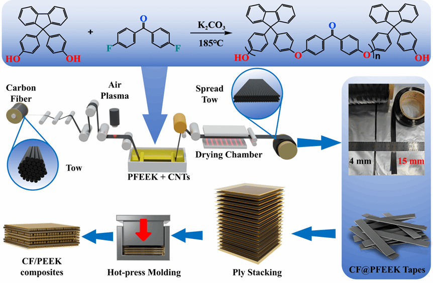 研究团队利用前期工作中合成的耐高温、易浸渍、且具有优异相容性的PEEK衍生物(PFEEKs)作为CF/PEEK复合材料的界面粘结剂(Huichao Liu* et al. Composite Structures 2025, 362, 119107.),通过超薄展纤技术将12K碳纤维丝束展宽展薄,制备了幅宽为15 mm,厚度可低至30 μm的超薄热塑性碳纤维带(相关工作见Huichao Liu* et al. Composites Part B 2024, 284, 111718;Huichao Liu* et al. Polymer Composites 2025, 46, 13073),并采用连续化改性工艺,在碳纤维带中引入不同含量的羧基化碳纳米管(CNTs),成功在碳纤维表面构建了微观尺度下的梯度模量过渡层,并进一步通过超薄碳纤维带与PEEK薄膜的铺层结构化设计,制备了同时具有高面内力学性能与高抗冲击性能的CF/PEEK复合材料(见图1)。