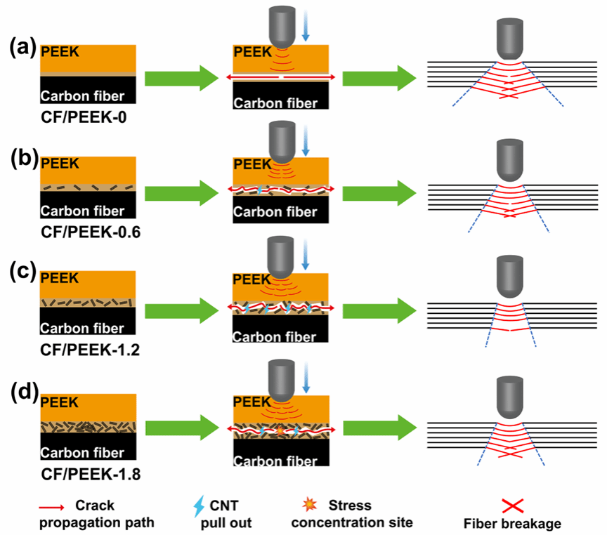 碳纤维增强聚醚醚酮(CF/PEEK)复合材料具有轻质高强、抗疲劳、耐高温、耐腐蚀、可回收等特性,在航空航天、国防军工、机器人等领域具有广泛的应用前景。然而,碳纤维(200-600 GPa)与树脂基体(2-5 GPa)之间的巨大模量差异,严重降低了其在低速冲击(LVI)载荷下的应力传递效率。国产探花