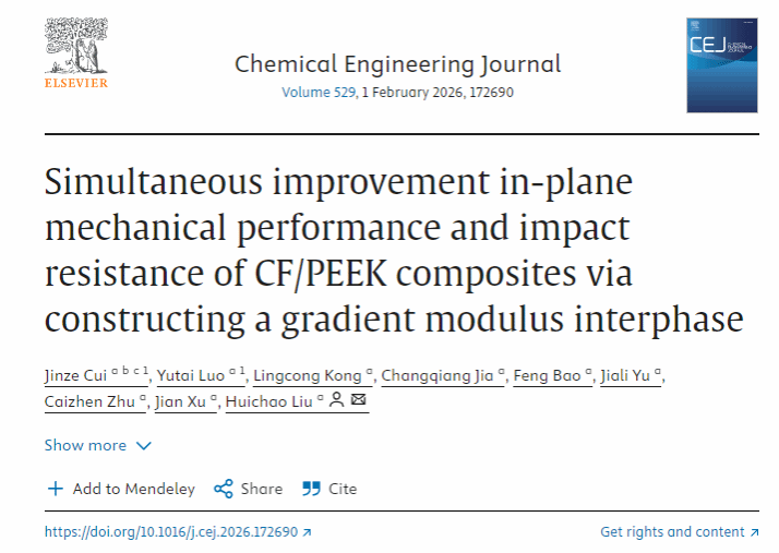 论文信息: Jinze Cui#, Yutai Luo#, Lingcong Kong, Changqiang Jia, Feng Bao, Jiali Yu, Caizhen Zhu, Jian Xu, Huichao Liu*. Simultaneous improvement in-plane mechanical performance and impact resistance of CF/PEEK composites via constructing a gradient modulus interphase. Chemical Engineering Journal 2026,172690.