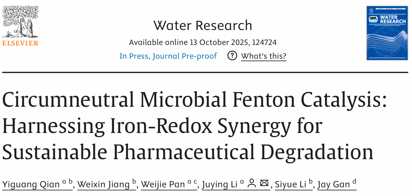 李菊英研究团队在《Water Research》(影响因子12.8,中科院1区,Nature Index期刊)上发表了题为《Circumneutral Microbial Fenton Catalysis: Harnessing Iron-Redox Synergy for Sustainable Pharmaceutical Degradation》的研究论文。该团队钱毅光副教授为第一作者,李菊英副教授为唯一通讯作者。研究成果打破了传统芬顿技术对酸性条件的依赖,大幅降低能耗与化学试剂消耗,为制药废水的低碳治理提供了新范式。